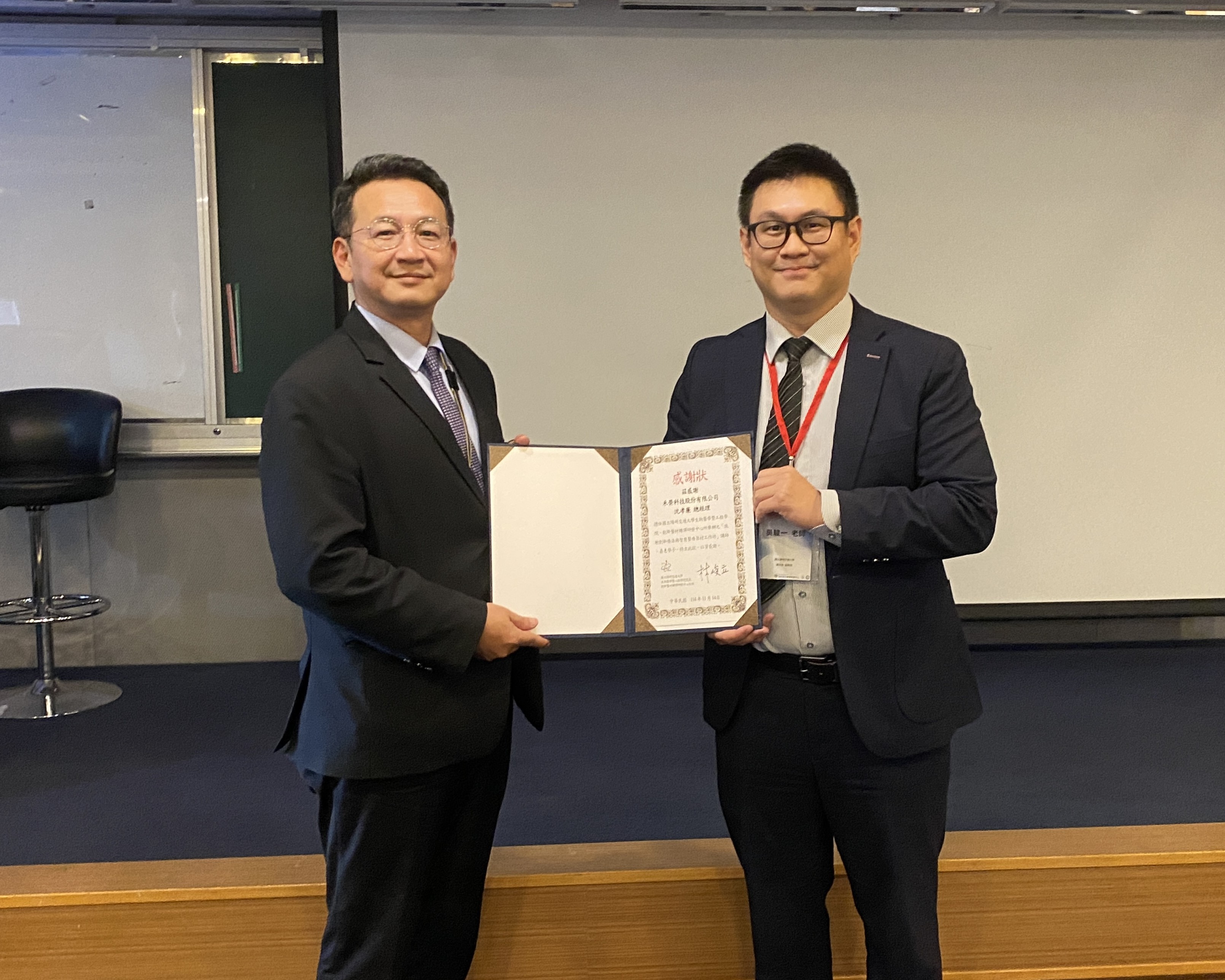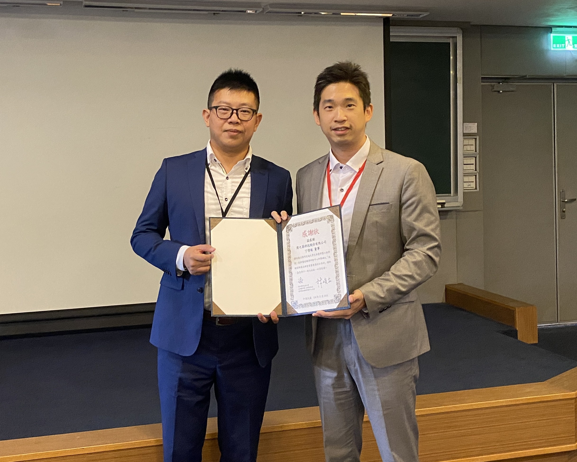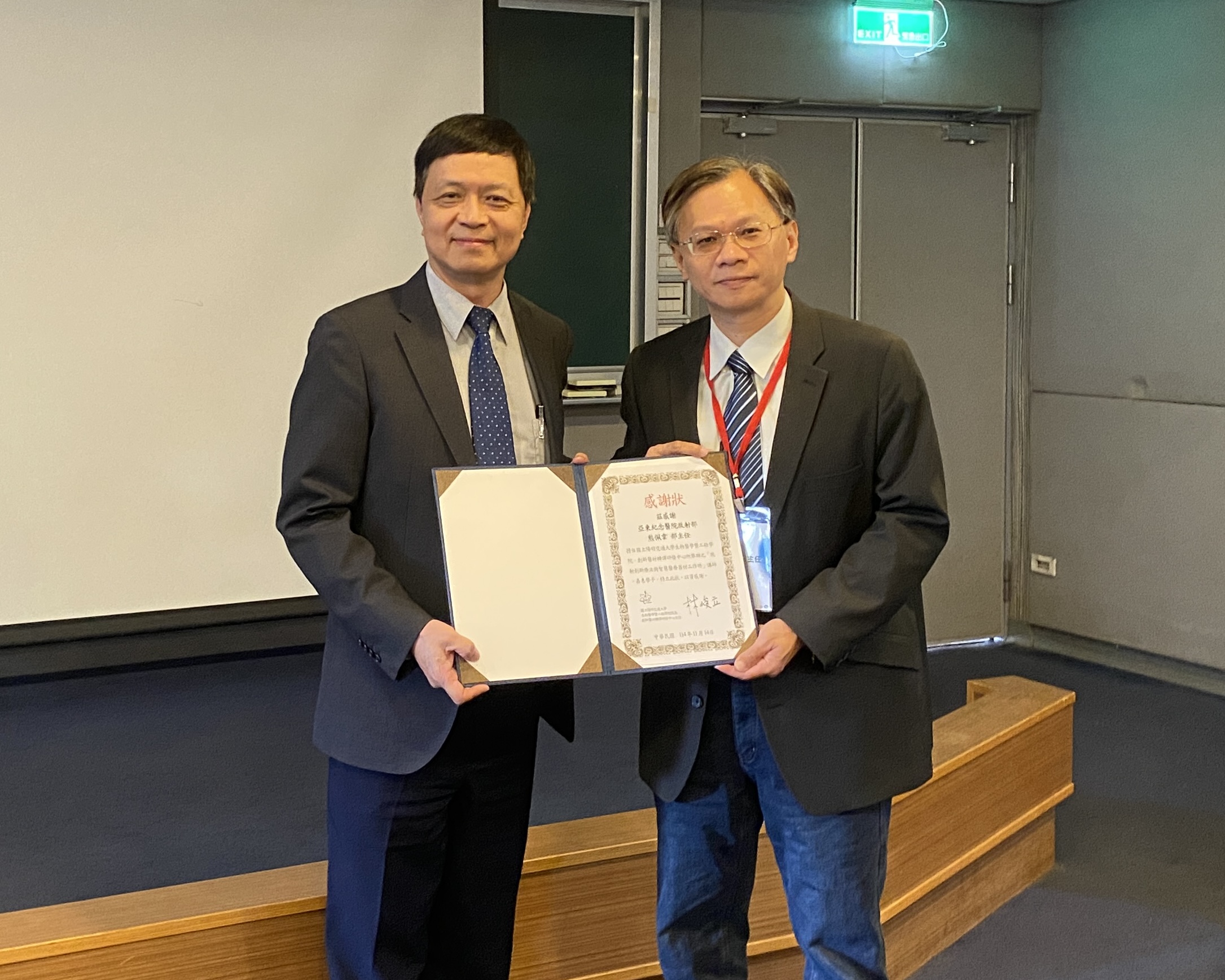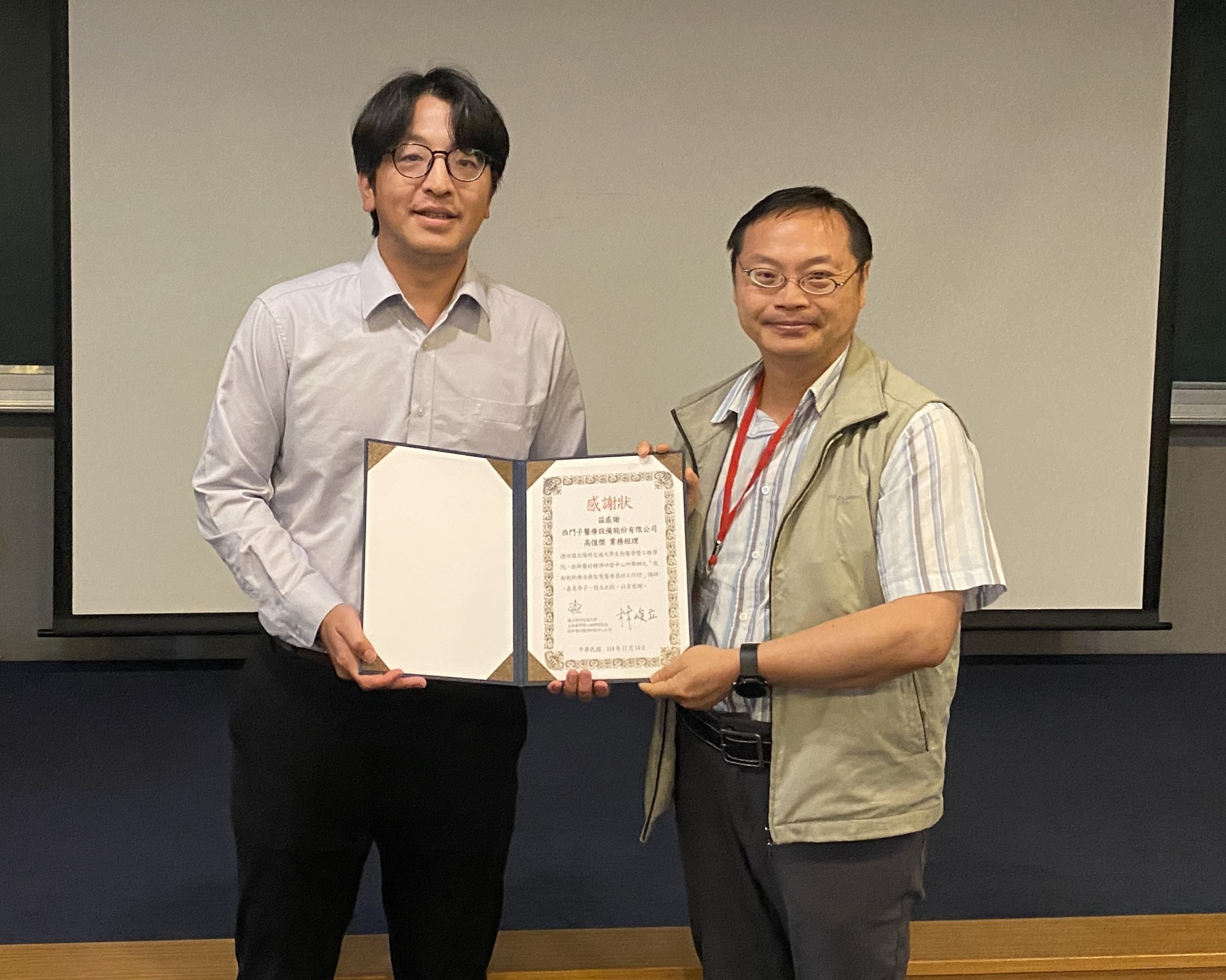 商之器科技股份有限公司 丁偉能董事暨集團副總經理(左)於演講後獲頒感謝狀與紀念品,由本院醫放系 盧家鋒教授(右)代表致贈