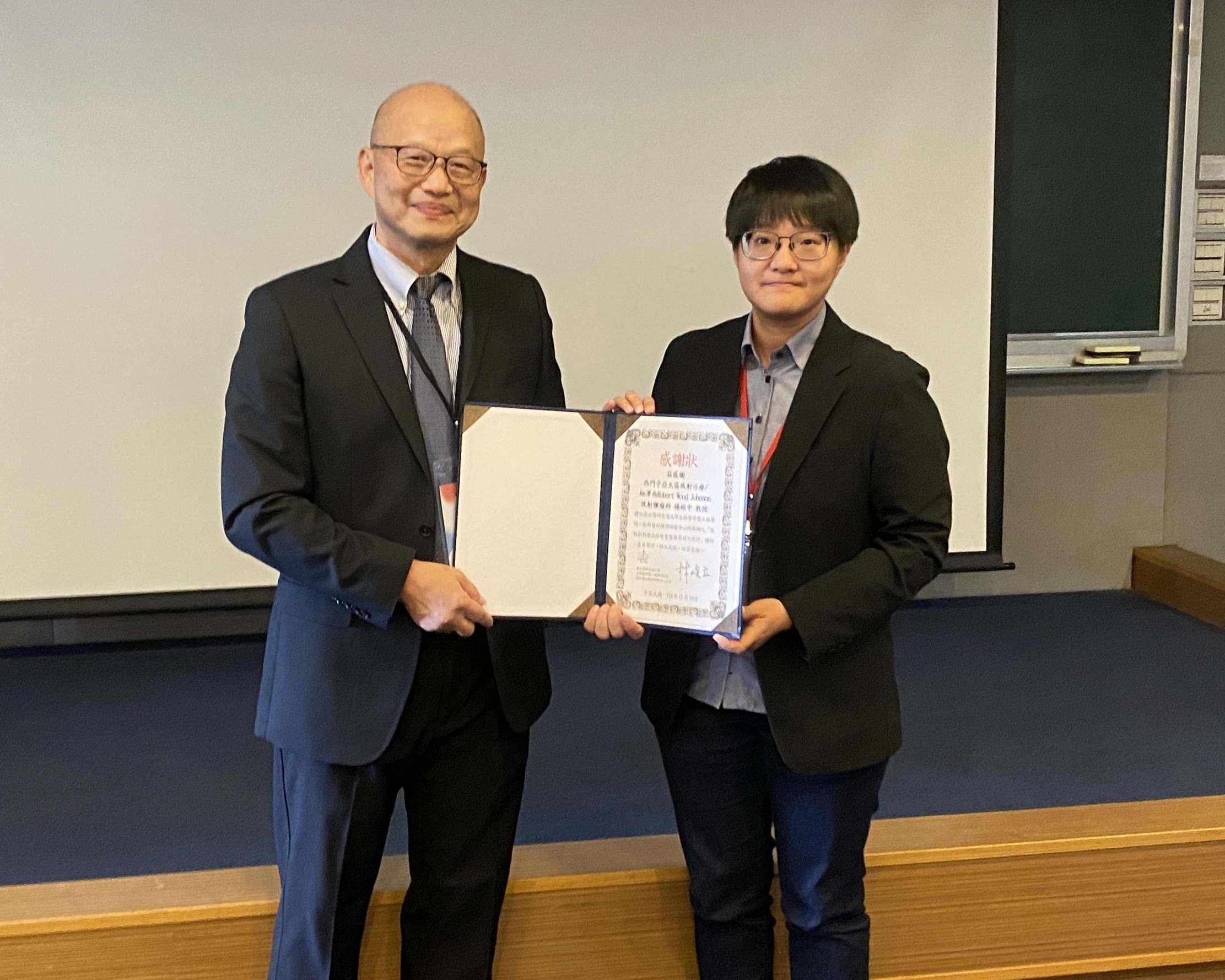 禾榮科技股份有限公司 沈孝廉總經理(左)於演講後獲頒感謝狀與紀念品,由本院醫放系 吳駿一副教授(右)代表致贈