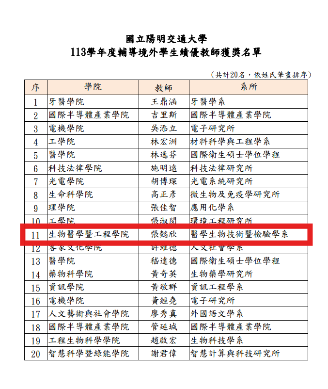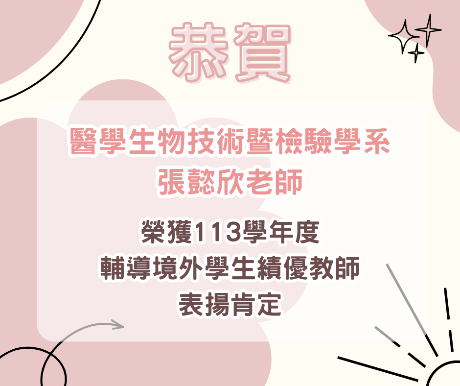 恭賀本院 醫學生物技術暨檢驗學系 張懿欣老師 獲本校「113學年度輔導境外學生績優教師」表揚肯定